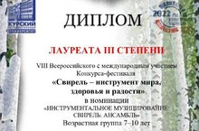 Поздравляем ансамбль свирелей "Переулок музыкантов" (руководитель - учитель музыки Халилова В.В.) с весьма солидной наградой - первоклассники занимались первый год и достойно выступили на Всероссийском конкурсе "Свирель - инструмент мира, здоровья и радости". Так держать!