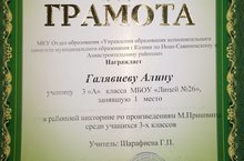 Галявиева Алина ученица 3-го класса нашего лицея, заняла I место в районной викторине по произведениям М. Пришвина среди учащихся 3-х классов. Учитель: Шарафиева Г.П.