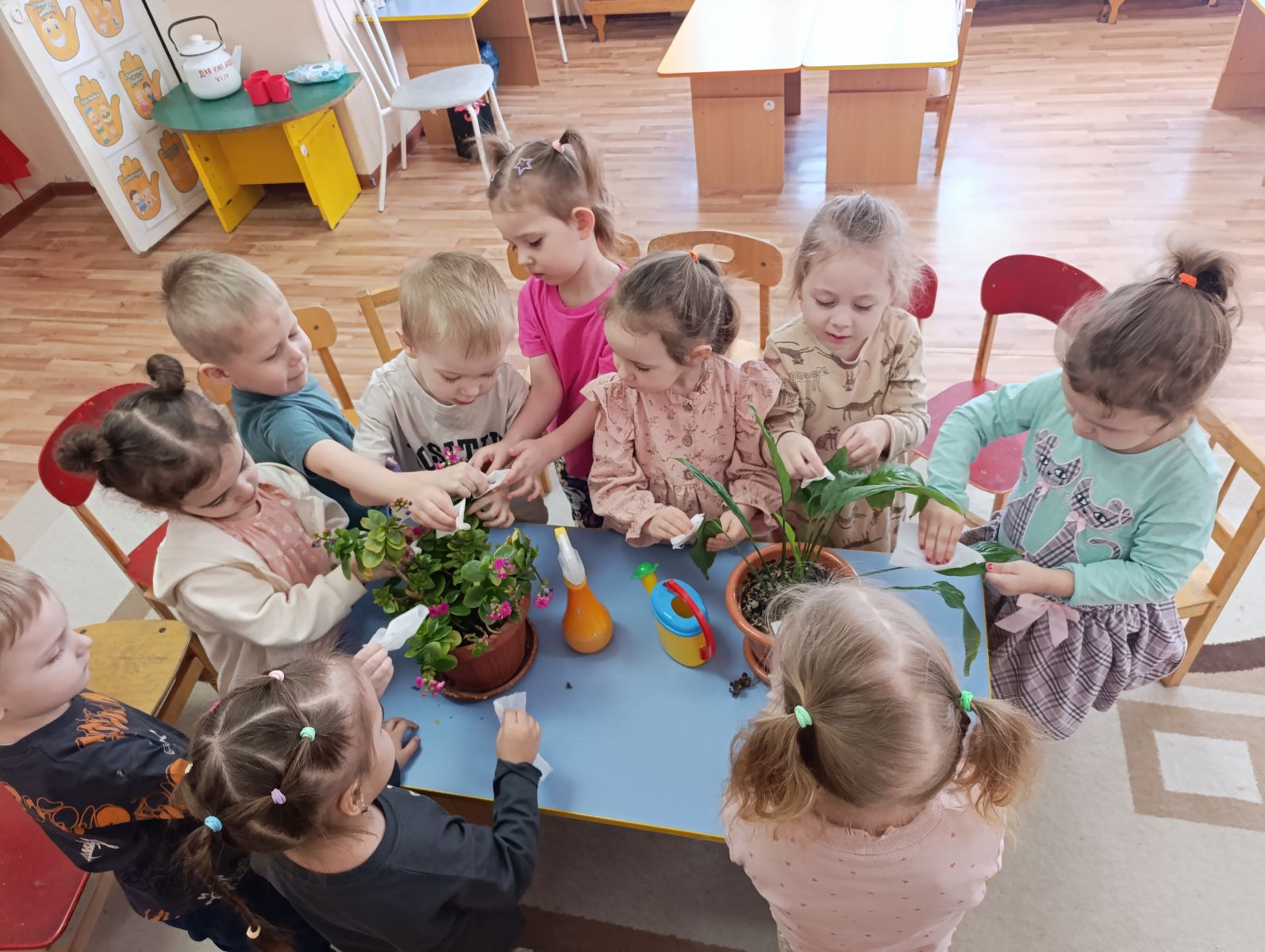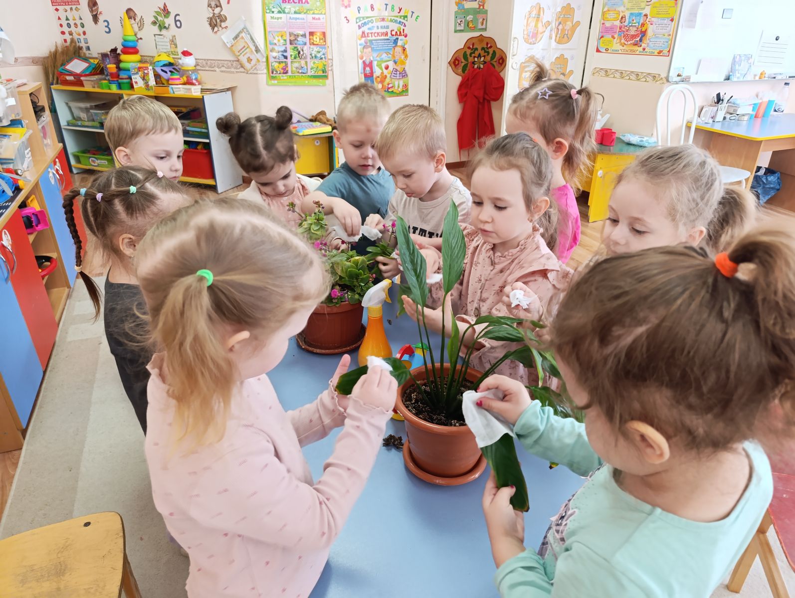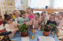 Комнатные растения в детском саду - это не только предмет интерьера, но и средство очищения воздуха, средство знакомства и общения малышей с природой. Малыши младшей группы "Ручеёк" очень любят наблюдать и ухаживать за комнатными растениями в уголке природы. В процессе ухода за растениями воспитанники вместе с воспитателем, Отиной Марией Николаевной, узнают, что для роста цветов нужны земля, вода и воздух, а также учатся правильно держать лейки, поливать растения, рыхлить почву и протирать крупные листочки влажной тряпочкой. Такие элементарные трудовые поручения воспитывают интерес к комнатным растениям и желание ухаживать за ними.