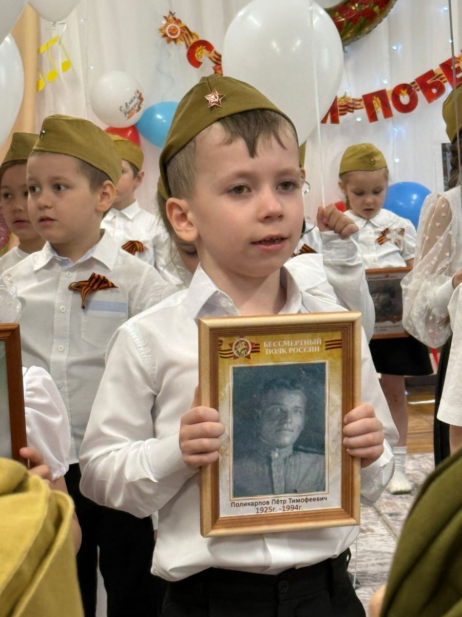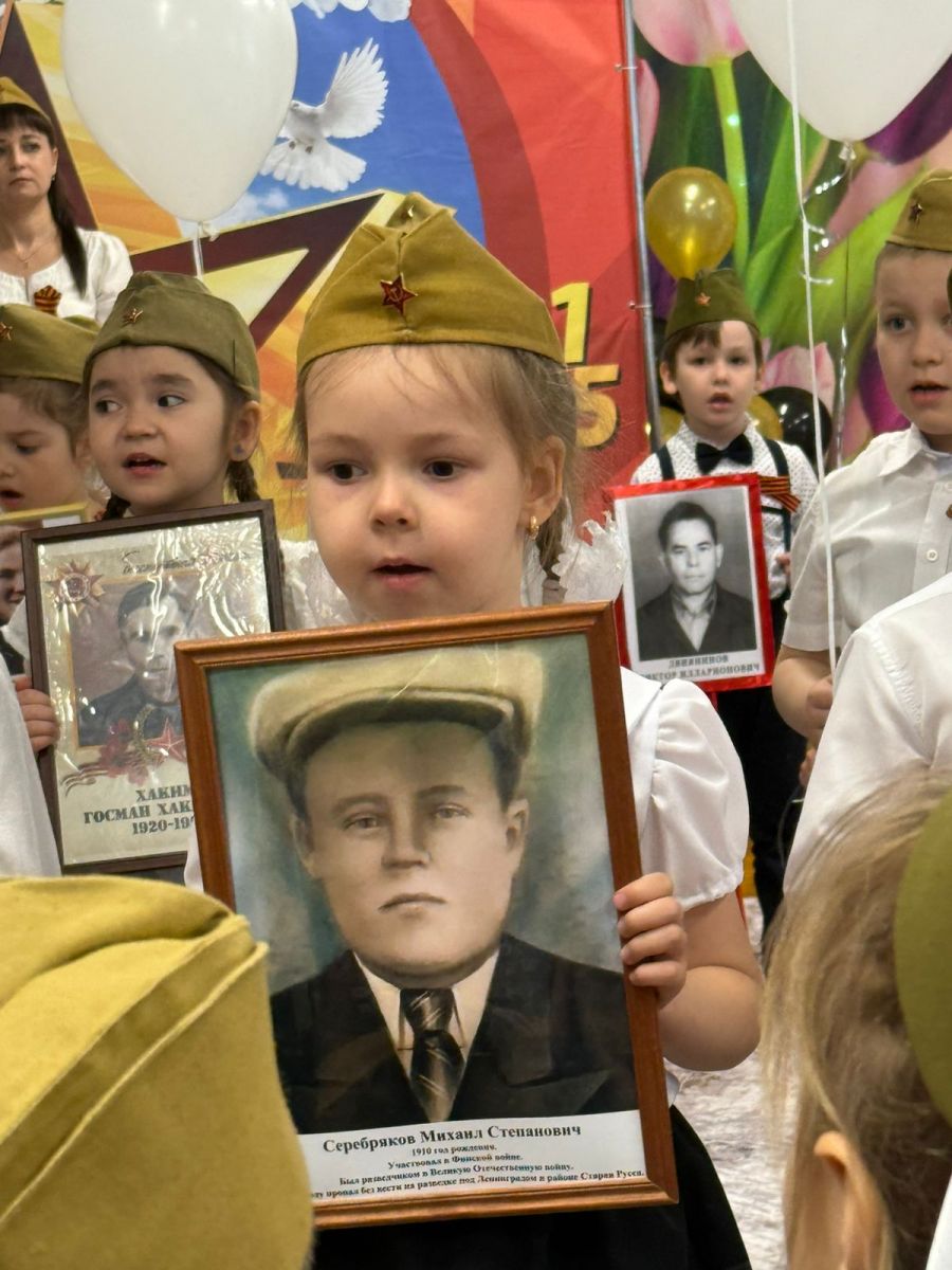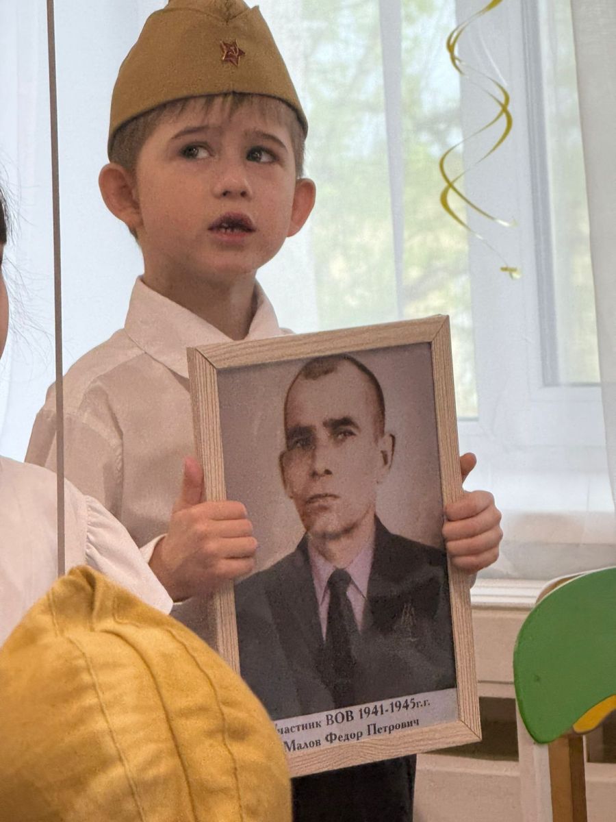 В нашем детском саду прошло мероприятие, посвященное 80-летию Дня Победы. Накануне утренника педагоги рассказали детям о начале войны, о том, как нелегко досталась победа. У каждого ребёнка на празднике был портрет родственника, участвовавшего в ВОВ. Мы стремимся воспитать в дошкольниках чувство патриотизма, сопереживания и уважения к ветеранам Великой Отечественной войны.