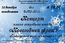 Приглашаем вас на концерт класса эстрадного вокала "Новогодний фреш", который состоится 18 декабря в 18.00, по адресу Академика Павлова, 25 -