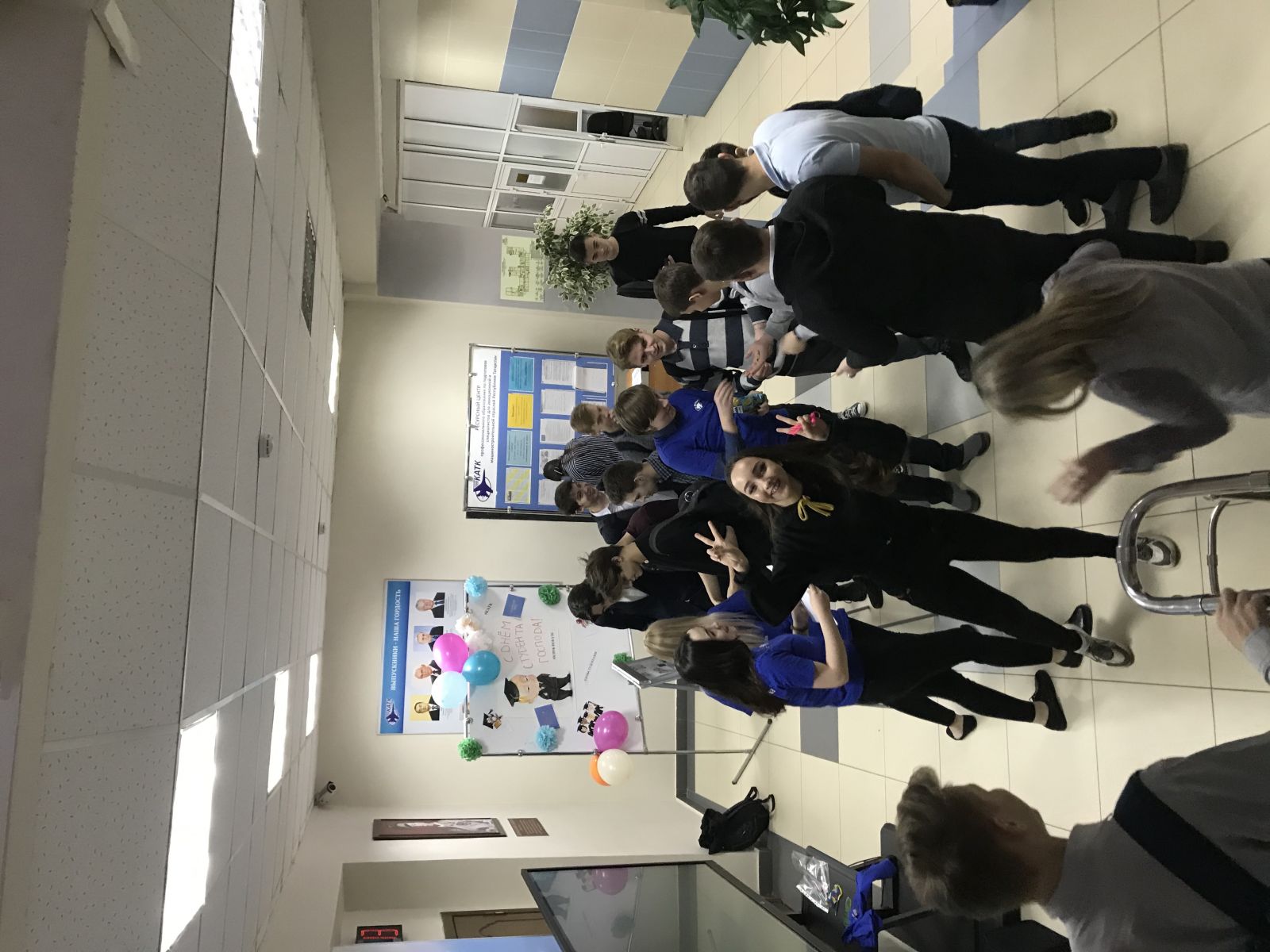 Так случилось, что именно сегодня студенты нашего колледжа отмечали этот праздник, провели флэш-моб, посвященный Дню студента. Ребята устроили танцевальный марафон, энергичные движения в ритм музыки дают позитивный настрой молодежи. Такие мероприятия в авиационном колледже являются доброй традицией и проводятся ко Дню студента каждый год. Организовывая их, учащиеся старших курсов поздравляют с этим праздником первокурсников и принимают новичков в свой дружный коллектив. В Татьянин день поздравляют всех студентов, а заодно и преподавателей, это отличный повод устроить фотосессию с преподавателями.