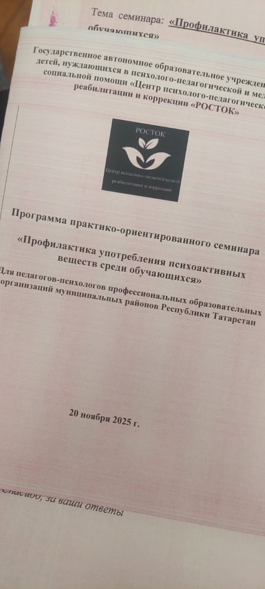 Опубликовано: 21.11.202520 ноября в Центре «Росток» состоялся практико-ориентированный семинар: «Профилактика употребления психоактивных веществ среди обучающихся» для руководителей ППМС служб и Центров, в котором приняла участие педагог-психолог колледжа Якушина Вероника Ихсановна. Спикерами выступили заместитель главного врача по детской наркологии Республиканского наркологического диспансера Степан Криницкий, заместитель начальника УОД УУД и ПНД МВД по РТ Евгения Боброва, педагог-психолог ГАПОУ «Казанский педагогический колледж» Салимова Гузалия, так же Сарапкина Ольга Николаевна педагог-психолог ГАОУ ЦППРК «Росток».