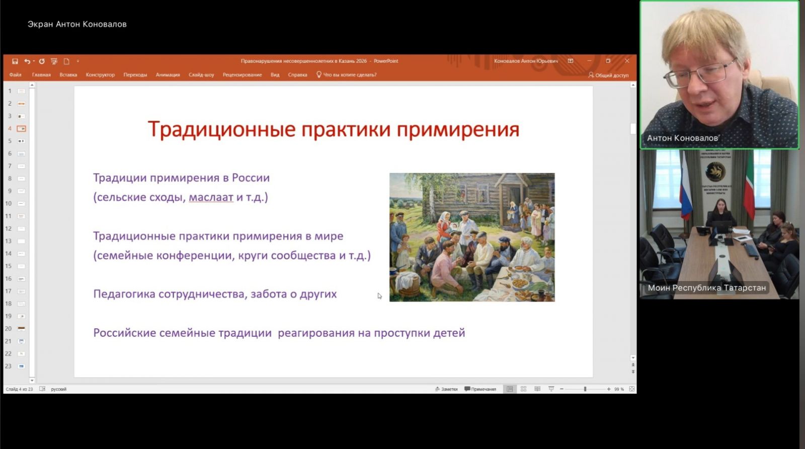 Опубликовано: 11.02.2026Сегодня ответственные специалисты нашего колледжа приняли участие в вебинаре на тему «Профилактика деструктивных явлений. Восстановительное правосудие в рамках профилактики правонарушений в молодежной среде» рамках реализации комплекса мер по профилактике правонарушений в образовательной среде Республики Татарстан, реализации межведомственного плана комплексных мероприятий по реализации Концепции развития сети служб медиации.