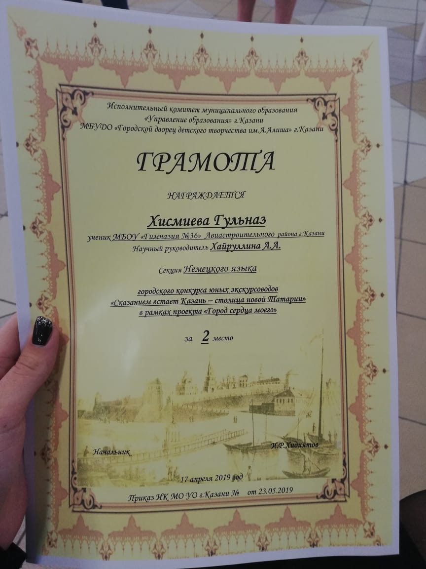 В марте-апреле этого года ученики старших классов принимали участие в различных конкурсах и фестивалях, в которых заняли призовые места. В конкурсе «Юный экскурсовод» призовое место заняла ученица 8Б класса Хисмиева Гульназ. Она же и ученица 9Б класса Закирова Лиана являются победителями суперфинала в этом же конкурсе в различных номинациях. В рамках «Фестиваля иностранных языков» наши ученики приняли участие в конкурсе чтецов на немецком языке. Победители этого конкурса:
