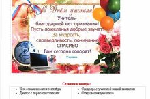 Учащимися гимназии 2 октября 2015 года был проведен праздничный концерт, посвященный Дню Учителя. В зале царила благоприятная, праздничная атмосфера. Дети порадовали своих любимых учителей красивыми номерами. Зрителям особо запомнились игра на флейте(Салатов Артем, 1Б класс), зажигательный латино-американский танец(Хайруллина Диана, 1В класс), выступление ансамбля «Фантазеры» с новым репертуаром и многое другое.