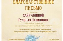 Администрация школы выражает благодарность Г.Н. Хайруллиной за активное привлечение школьников на культурно-образовательные мероприятия музея.