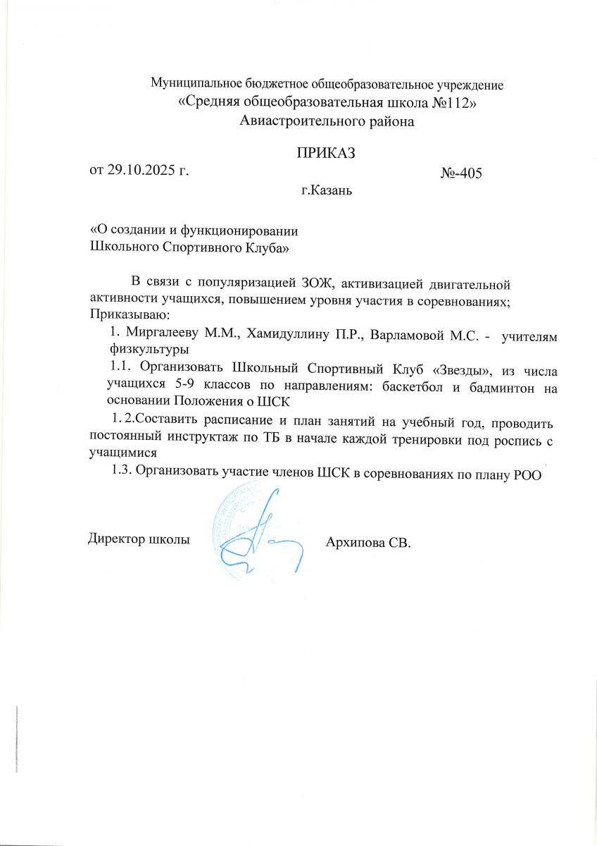 Приказ о создании "Школьного спортивного клуба"