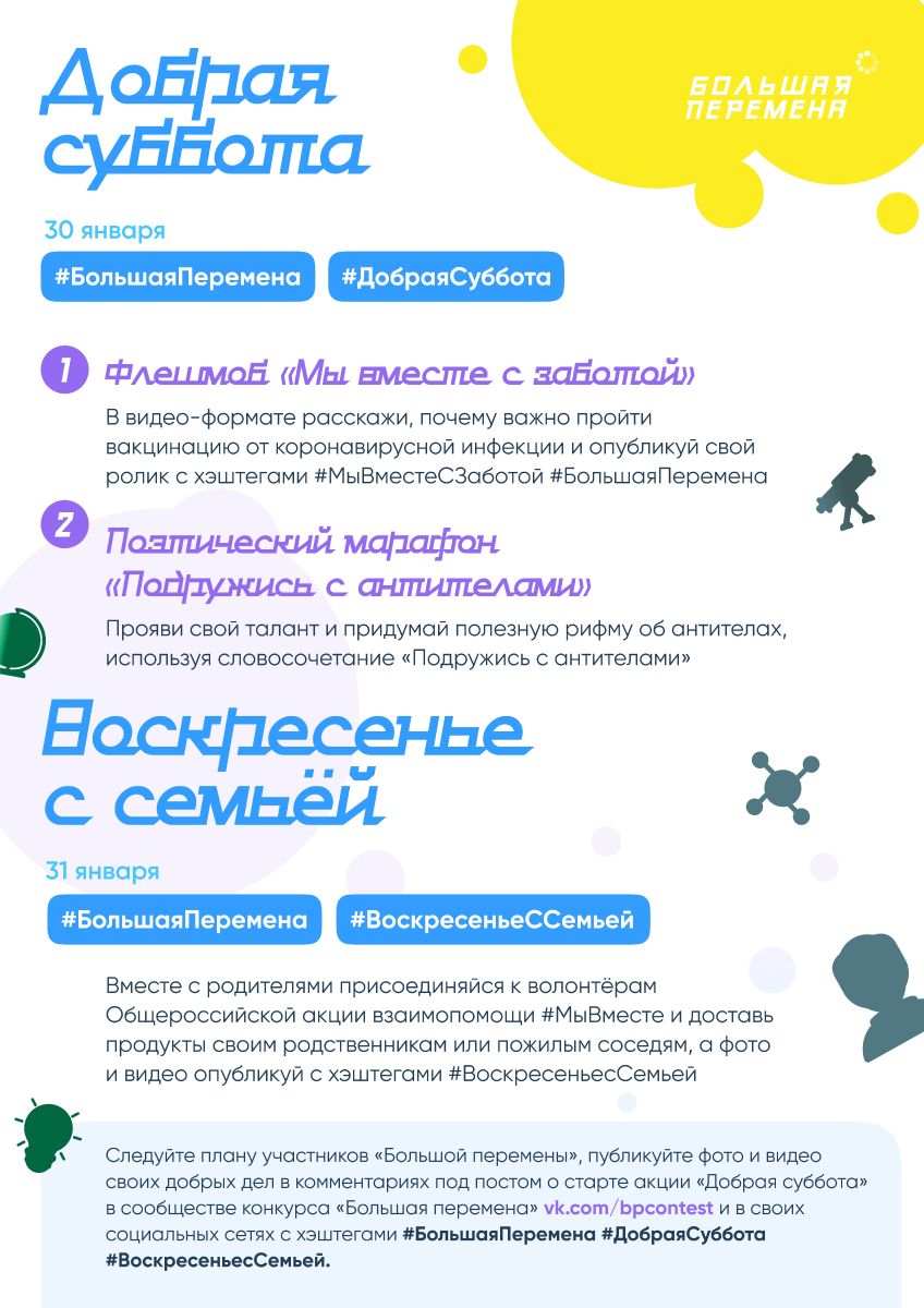 Участники Всероссийского конкурса для школьников «Большая перемена» – проекта президентской платформы «Россия – страна возможностей» – в рамках еженедельной акции «Добрая суббота» присоединятся к проекту Всероссийской акции взаимопомощи #МыВместе по информированию граждан о вакцинации от коронавирусной инфекции.