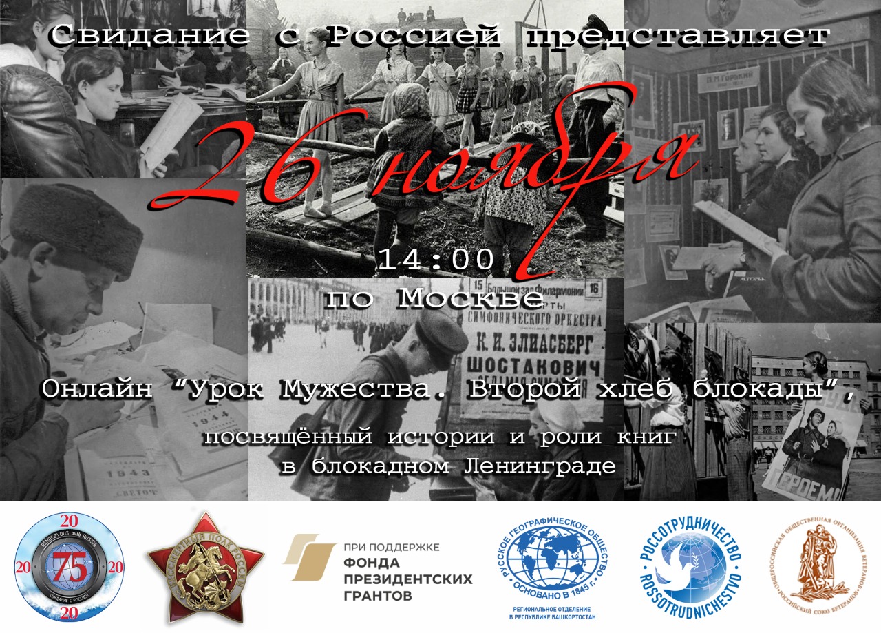 В рамках Международного медиа проекта "Свидание с Россией" по инициативе Центра исторического добровольчества «Паруса истории» совместно с Некоммерческим партнёрством "КиТ" при поддержке Россотрудничества и Бессмертного полка России 26 ноября в 14.00 по московскому времени состоялся онлайн-урок мужества «Второй хлеб блокады».