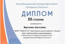 Мы поздравляем ученицу 6б класса Фролову Ангелину и педагога дополнительного образования, руководителя школьного вокального кружка "Музыкальная радуга" Сергееву И. А. с заслуженной победой в Республикпнском- конкурсе фестивале "Патриоты России! "