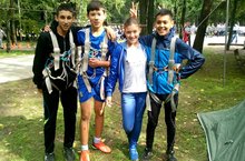 Учащиеся 7А (Абдуллаев С., Веин А., Файзрахманов Б., Иматшоев Р.) держали площадку по спортивному туризму, помогая детям проходить скалолазную трассу и рассказывая о программе летнего туристического лагеря, фотографии из которого были развешены по периметру их зоны.