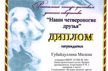 Поздравляем учащихся МБОУ «ООШ № 168» Гильманову Камиллу, Губайдуллину Милену, Жидких Никиту, занявших 3 место в региональном конкурсе-фестивале детского творчества «Наши четвероногие друзья»!