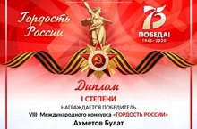 Поздравляем Ахметова Булата, воспитанника подготовительной группы № 3, победителя VIII Международного конкурса «Гордость России».