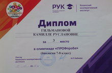 Поздравляем ученицу 8 класса Гильманову Камиллу, занявшую 3 место в олимпиаде «ПРОФпроба» (биология 7-8 класс). Благодарим учителя биологии Шишову Эльмиру Ришатовну за подготовку призера!