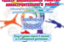 26,27,28 августа в Центре внешкольной работы Авиастроительного района по адресу: ул.Симонова, 12А с 10.00 до 13.00 и с 14.00 до 18.00 будет осуществляться запись в объединения. Вход только в масках и при соблюдении санитарных норм.