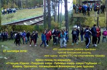 Кросс - поход. 28.09.2016Информацияпо проведению учебного семинара учащихся и педагогов общеобразовательных школ и ЦВР Авиастроительного района с совершением кросс - похода по маршруту «Станция Юдино - Лазурное озеро -Лебяжье озеро - озеро Глубокое - г. Казань, Оргсинтез, посвящённому Всемирному дню туризма.Согласно положения и Приказа Управления образования ИКМО г. Казани по Авиастроительному и Ново-Савиновскому районам и Приказу ЦВР № 279 от 13.09.16г. 27 сентября 2016г. был проведен учебный семинар и кросс-поход, посвящённому Всемирному дню туризма с присвоения участникам кросс- похода третьего юношеского разряда и сдачи ими норм ГТО.