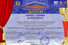 Поздравляем Азизову Фиалку Айдаровну с успешным выступлением и званием лауреата 1 степени на международном конкурсе профессионального мастерства - "На Олимпе" г.Москва. Желаем творческого вдохновения, успехов и побед!