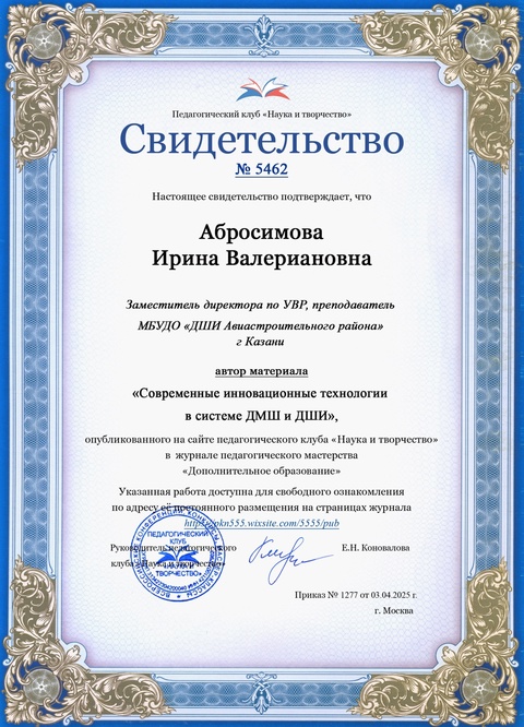 21. Педагогический клуб "Наука и творчество", Публикация на тему "Современные инновационные технологии в системе ДМШ и ДШИ" в журнале педагогического мастерства "Дополнительное образование", Абросимова И.В., 2025г., г.Москва;