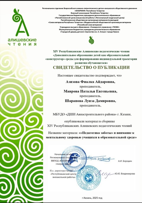 27.XIV Республиканские Алишевские педагогические чтения "Дополнительное образование детей как образовательный "конструктор" среды для формирования индивидуальной траектории развития обучающегося", Публикация в журнале на тему "Педагогика заботы" и внимание к ментальному здоровью учащихся в образовательной среде", Азизова Ф.А., Маврова Н.А., Шарапова Л.Д., 2025г, г.Казань;