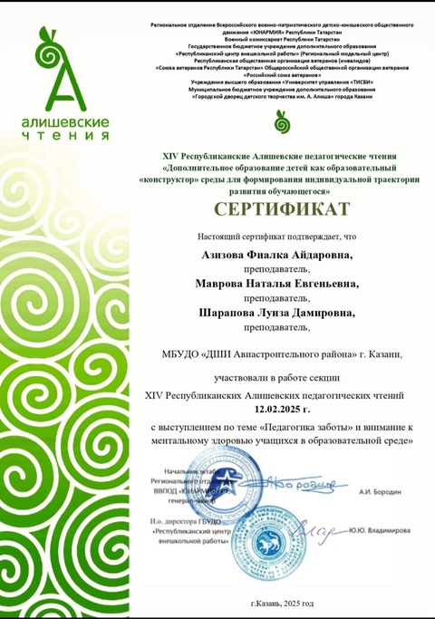26. XIV Республиканские Алишевские педагогические чтения "Дополнительное образование детей как образовательный "конструктор" среды для формирования индивидуальной траектории развития обучающегося", выступление на тему "Педагогика заботы" и внимание к ментальному здоровью учащихся в образовательной среде", .Азизова Ф.А., Маврова Н.Е., Шарапова Л.Д, 2025г, г.Казань;