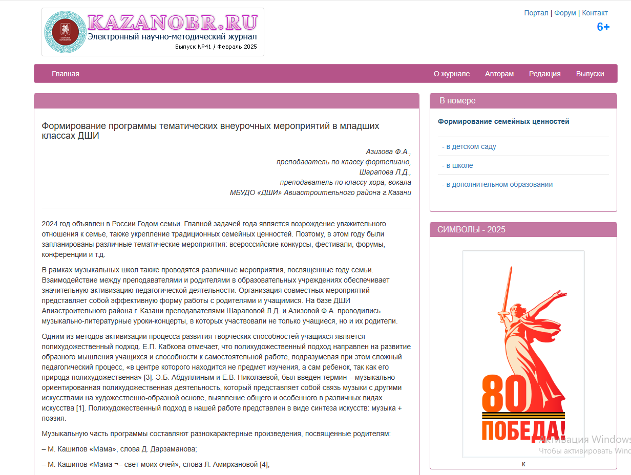 35.Электронный научно-методический журнал "KAZANOBR.RU" № 41, Публикация на тему "Формирование программы тематических внеурочных мероприятий в младших классах ДШИ", Азизова Ф.А., Шарапова Л.Д., февраль, 2025г.