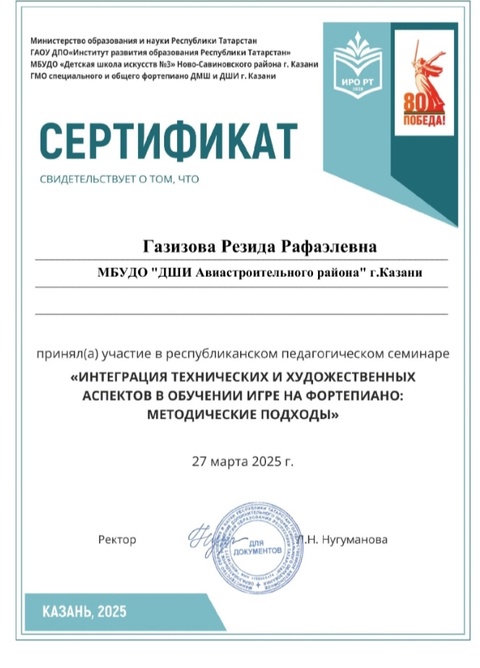 29. Республиканский педагогический семинар "Интеграция технических и художественных аспектов в обучении игре на фортепиано: методические подходы", Участие, Газизова Р.Р., 2025г., г.Казань;