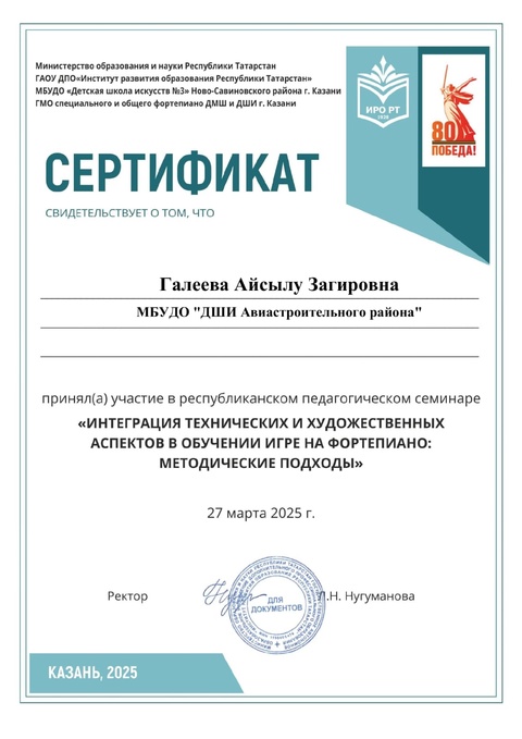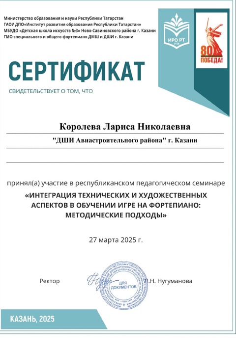 30. Республиканский педагогический семинар "Интеграция технических и художественных аспектов в обучении игре на фортепиано: методические подходы", Участие, Королева Л.Н., 2025г., г.Казань3127. Республиканский педагогический семинар "Интеграция технических и художественных аспектов в обучении игре на фортепиано: методические подходы", Участие, Галеева А.З., 2025г., г.Казань;