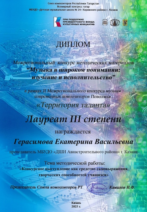 16. Межрегиональный конкурс методических материалов "Музыка в широком понимании: изучение и исполнительство" в рамках II Межрегионального конкурса-фестиваля музыки современных композиторов Поволжья "Территория таланта", методическая работа "Конкурсное выступление как средство самовыражения творческих способностей учащихся", Лауреат 3 степени, 2025г., г.Казань, Герасимова Е.В.;