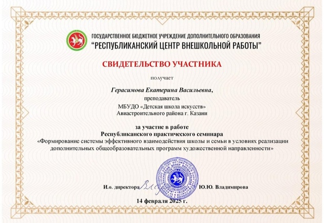 16. Республиканский практический семинар "Формирование системы эффективного взаимодействия школы и семьи в условиях реализации дополнительных общеобразовательных программ художественной направленности", 14.02.2025г., г.Казань, Герасимова Е.В., Участие;