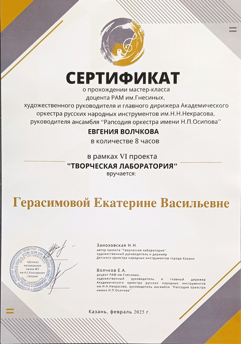 8. Публикация в ВИМЦ им. М.В. Ломоносова по теме: «Формирование мотивации учащихся детской музыкальной школы к обучению игре на балалайке», февраль, 2020 г. , Сертификат Герасимова Е.В.
