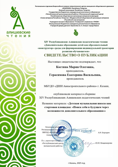 19. XIV Республиканские Алишевские педагогические чтения "Дополнительное образование детей как образовательный "конструктор" среды для формирования индивидуальной траектории развития обучающегося", Публикация в журнале на тему "ДМШ как стартовая площадка: "Поиск себя в будущем через возможности дополнительного образования", Костина М.О., Герасимова Е.В., 2025г, г.Казань;