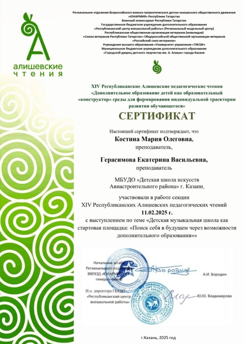 18. XIV Республиканские Алишевские педагогические чтения "Дополнительное образование детей как образовательный "конструктор" среды для формирования индивидуальной траектории развития обучающегося", выступление на тему "ДМШ как стартовая площадка: "Поиск себя в будущем через возможности дополнительного образования", Костина М.О., Герасимова Е.В., 2025г, г.Казань;