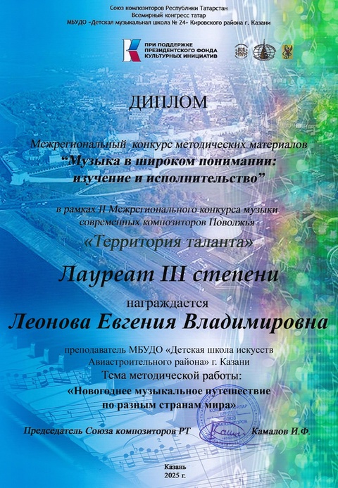 17. Межрегиональный конкурс методических материалов "Музыка в широком понимании: изучение и исполнительство" в рамках II Межрегионального конкурса-фестиваля музыки современных композиторов Поволжья "Территория таланта", методическая работа "Новогоднее музыкальное путешествие по разным странам мира", Лауреат 3 степени, 2025г., г.Казань, Леонова Е.В.;