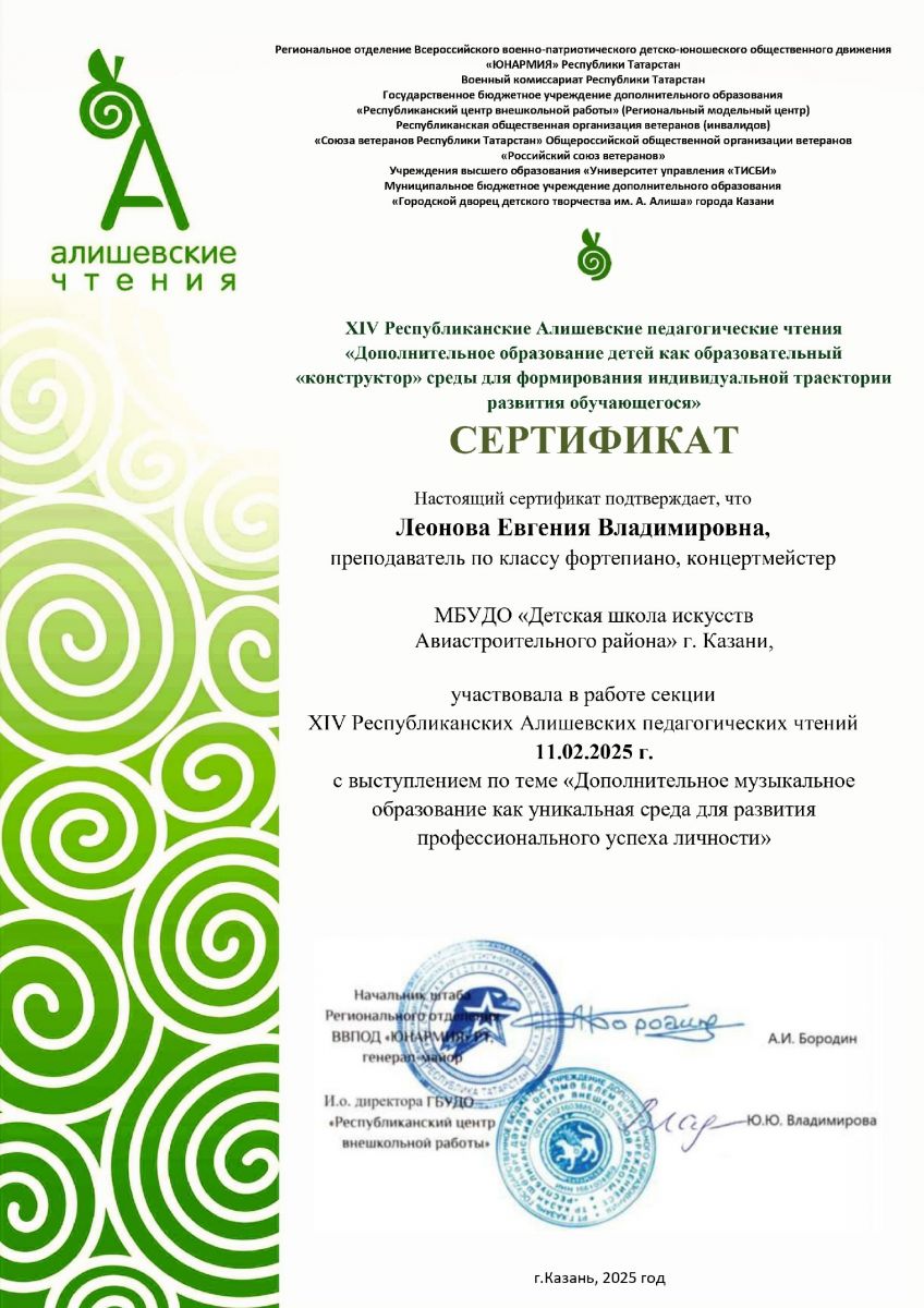 25. XIV Республиканские Алишевские педагогические чтения "Дополнительное образование детей как образовательный "конструктор" среды для формирования индивидуальной траектории развития обучающегося", выступление на тему "Дополнительное музыкальное образование как уникальная среда для развития профессионального успеха личности", Леонова Е.В, 2025г, г.Казань;