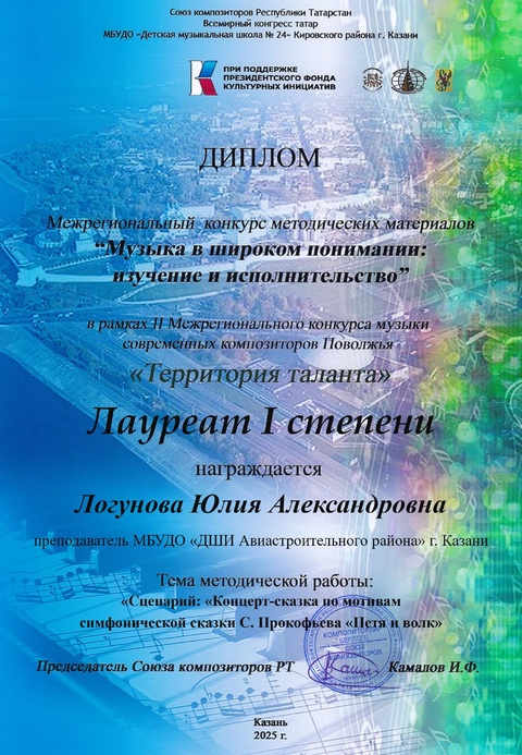 14. Межрегиональный конкурс методических материалов "Музыка в широком понимании: изучение и исполнительство" в рамках II Межрегионального конкурса-фестиваля музыки современных композиторов Поволжья "Территория таланта", методическая работа "Сценарий: "Концерт-сказка по мотивам симфонической сказки С.Прокофьева "Петя и волк", Лауреат 1 степени, 2025г., г.Казань, Логунова Ю.А.;