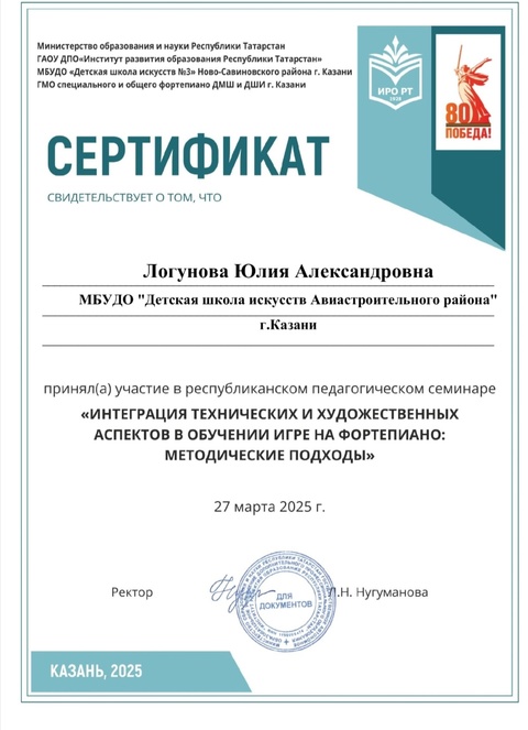 31. Республиканский педагогический семинар "Интеграция технических и художественных аспектов в обучении игре на фортепиано: методические подходы", Участие, Логунова Ю.А.,, 2025г., г.Казань;