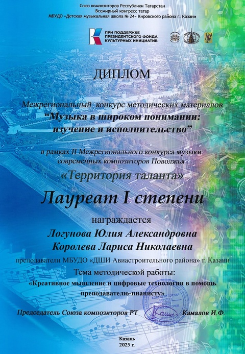 13. Межрегиональный конкурс методических материалов "Музыка в широком понимании: изучение и исполнительство" в рамках II Межрегиональого конкурса-фестиваля музыки современных композиторов Поволжья "Территория таланта", методическая работа "Кркативное мышление и цифровые технологии в помощь преподавателю-пианисту", Лауреат 1 степени, 2025г., г.Казань, Логунова Ю.А., Королева Л.Н.;