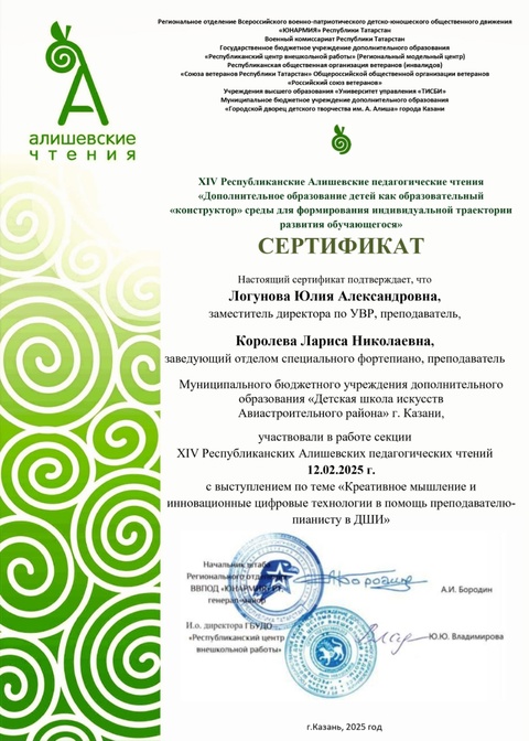 24. XIV Республиканские Алишевские педагогические чтения "Дополнительное образование детей как образовательный "конструктор" среды для формирования индивидуальной траектории развития обучающегося", Публикация в журнале на тему "Креативное мышление и инновациоонные цифровые технологии в помощь преподавателю пианисту в ДШИ", Логунова Ю.А., Королева Л.Н., 2025г, г.Казань;