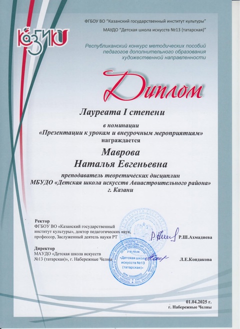 32. Республиканский конкурс методических пособий педагогов дополнительного образования художественной направленности, Лауреат 1 степени в номинации "Презентации к урокам и внеурочным мероприятиям", Маврова Н.Е.,01.04.2025г., г.Набережные Челны;