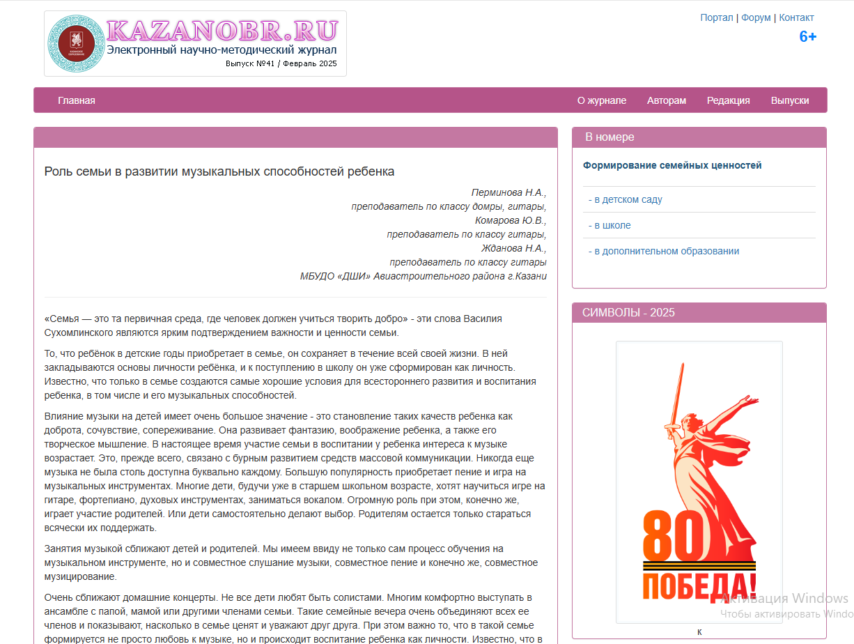 34. Электронный научно-методический журнал "KAZANOBR.RU" № 41, Публикация на тему "Роль семьи в развитии музыкальных способностей ребенка", Перминова Н.А., Комарова Ю.В., Жданова Н.А., февраль, 2025г.;