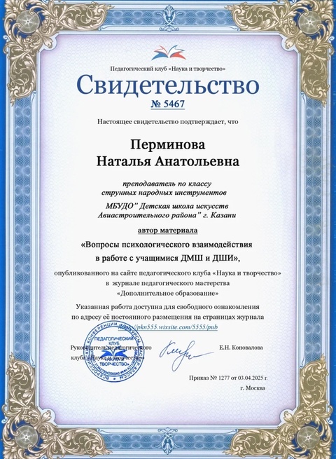 23. Педагогический клуб "Наука и творчество", Публикация на тему "Вопросы психологического взаимодействия в работе с учащимися ДМШ и ДШИ" в журнале педагогического мастерства "Дополнительное образование", Перминова Н.А., 2025г., г.Москва;
