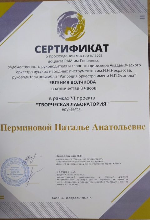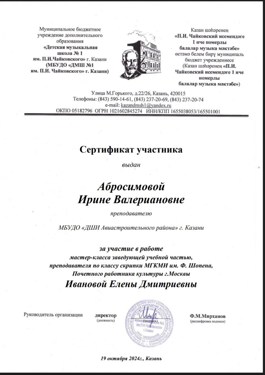 3. Городское методическое объединение преподавателей струнно-смычковых отделений ДМШ и ДШИ г.Казани, Мастер-класс Почетного работника г.Москвы Ивановой Е.Д., Абросимова И.В., Сертификат слушателя, 19.10.2024г., г.Казань