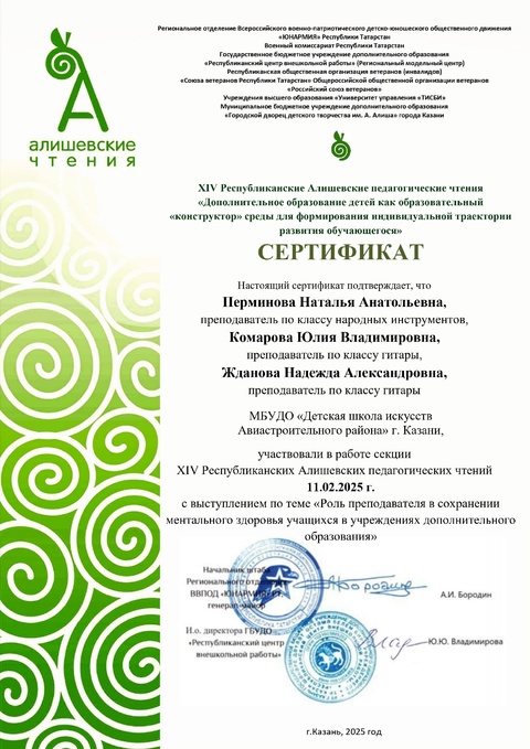 22. XIV Республиканские Алишевские педагогические чтения "Дополнительное образование детей как образовательный "конструктор" среды для формирования индивидуальной траектории развития обучающегося", выступление на тему "ДМШ как стартовая площадка: "Роль преподавателя в сохранении ментального здоровья учащихся в учреждениях дополнительного образования", Перминова Н.А., Комарова Ю.В., Жданова Н.А., 2025г, г.Казань;