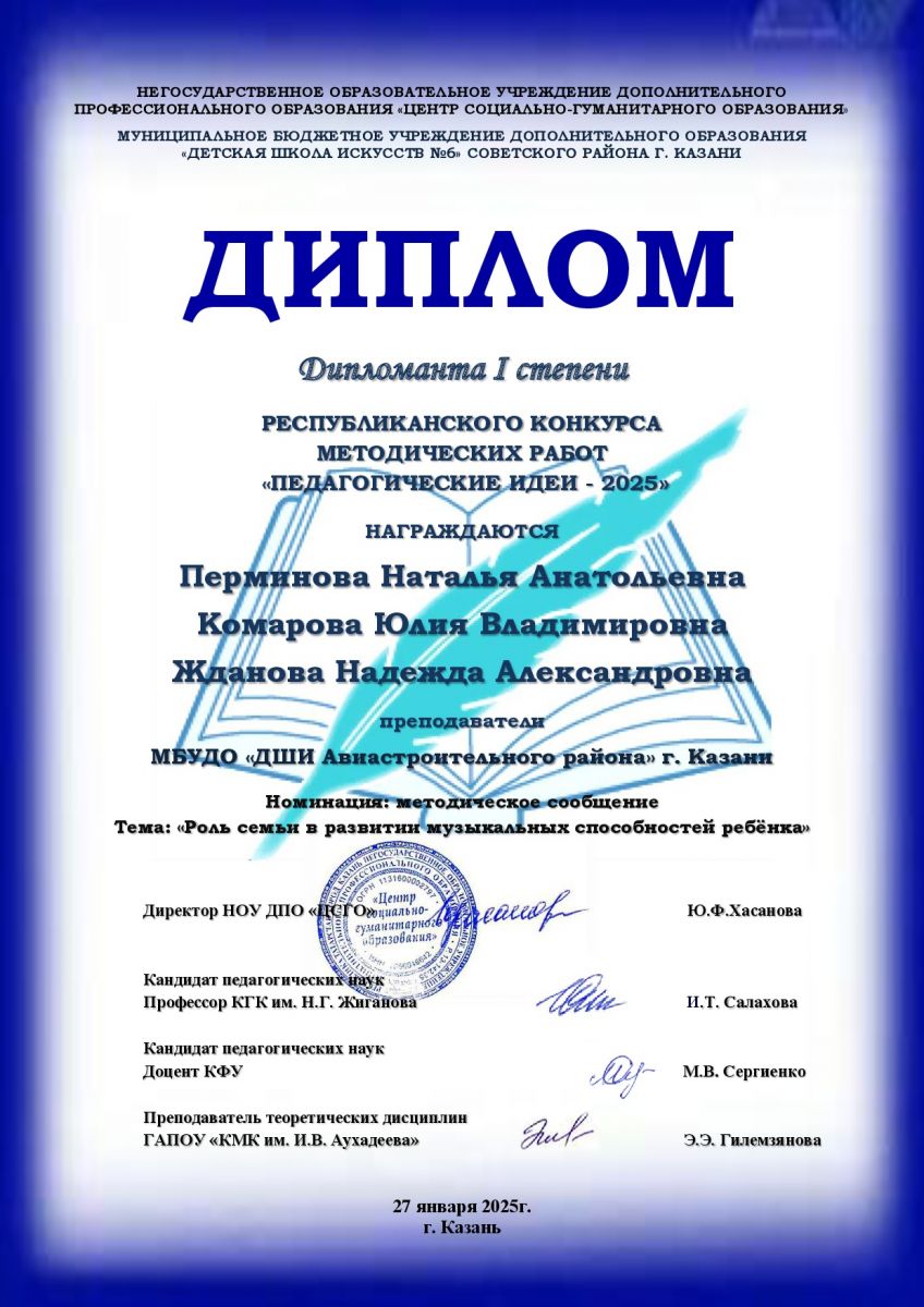 6. Республиканский конкурс методических работ "Педагогические идеи - 2025", методическое сообщение "Роль семьи в развитии музыкальных способностей ребенка", Дипломант 1 степени, 27.01.2025г., Перминова Н.А., Комарова Ю.В., Жданова Н.А.;