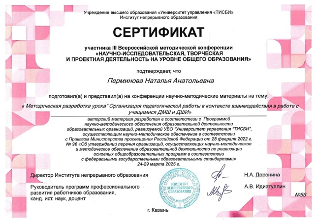 24. III Всероссийская методическая конференция "Научно-исследовательская, творческая и проектная деятельность на уровне общего образования", методическая разработка урока "Организация педагогической работы в контексте взаимодействия работы с учащимися ДМШ и ДШИ", УВО "Университет управления Тисби", 2025г., г.Казань, Перминова Н.А.;