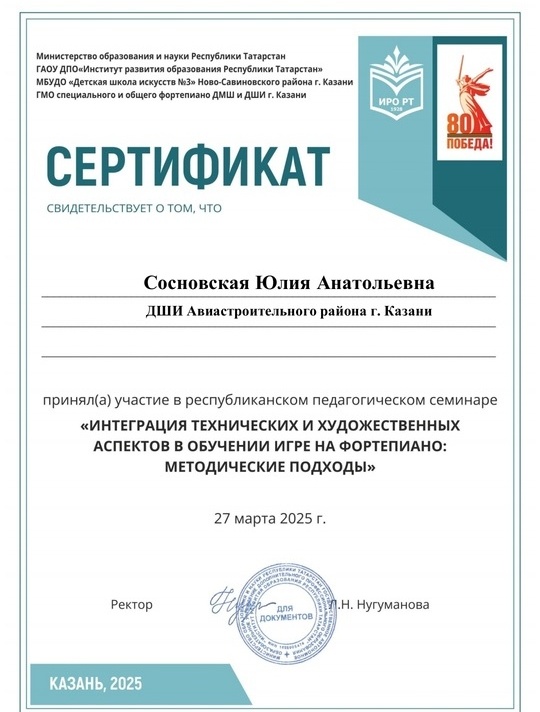 28. Республиканский педагогический семинар "Интеграция технических и художественных аспектов в обучении игре на фортепиано: методические подходы", Участие, Сосновская Ю.А., 2025г., г.Казань;