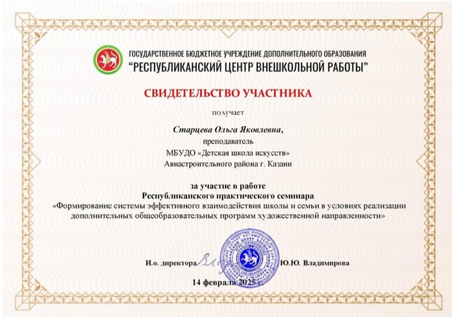 17. Республиканский практический семинар "Формирование системы эффективного взаимодействия школы и семьи в условиях реализации дополнительных общеобразовательных программ художественной направленности", 14.02.2025г., г.Казань, Старцева О.Я., Участие;