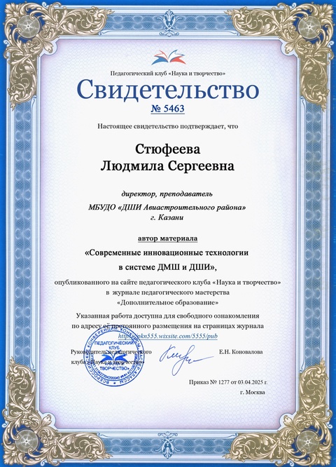 22. Педагогический клуб "Наука и творчество", Публикация на тему "Современные инновационные технологии в системе ДМШ и ДШИ" в журнале педагогического мастерства "Дополнительное образование", Стюфеева Л.С., 2025г., г.Москва;