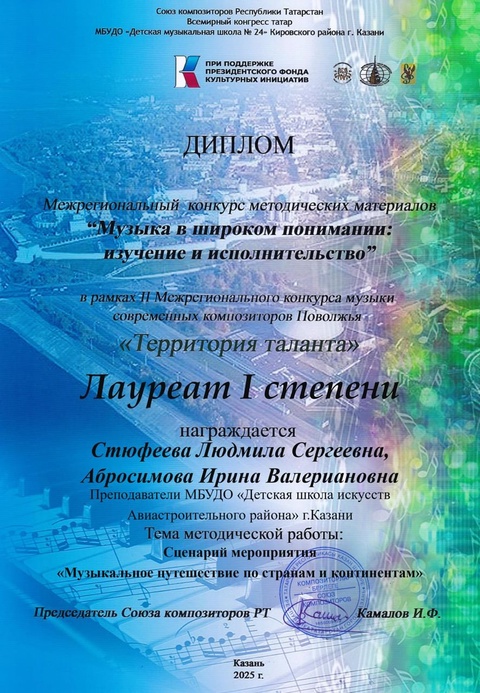 18. Межрегиональный конкурс методических материалов "Музыка в широком понимании: изучение и исполнительство" в рамках II Межрегионального конкурса-фестиваля музыки современных композиторов Поволжья "Территория таланта", методическая работа "Музыкальное путешествие по странам и континентам", Лауреат 1 степени, 2025г., г.Казань, Стюфеева Л.С., Абросимова И.В.;